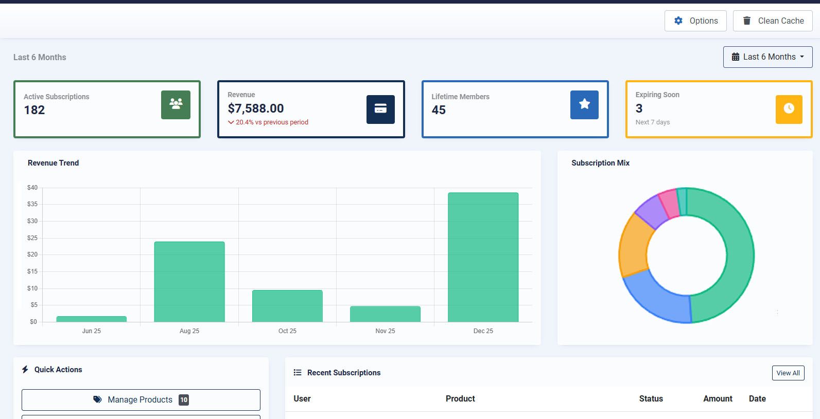Real-time stats, revenue charts, subscription trends, and recent activity all in one place.